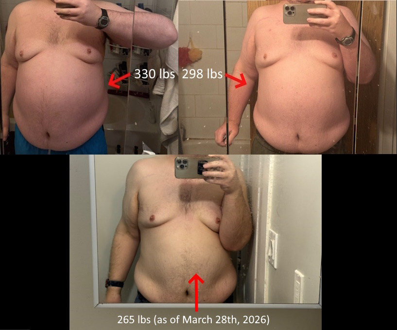If you lose motivation from not seeing results and give up easily, I’d suggest skipping looking at your weight scale to check it for a few days or even just stick to once a week and see if you see any results. If you check out my first post ever on this blog which I wrote about 2-3 days ago you’ll see the transformation that I have made with my journey from 330 pounds starting out to 265 pounds. It is true that I started this journey last year in 2025 at about the end of July. I started at that time because of different reasons, but I might have been able to start earlier maybe.